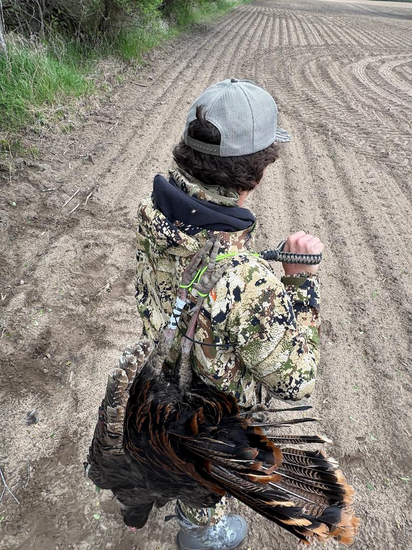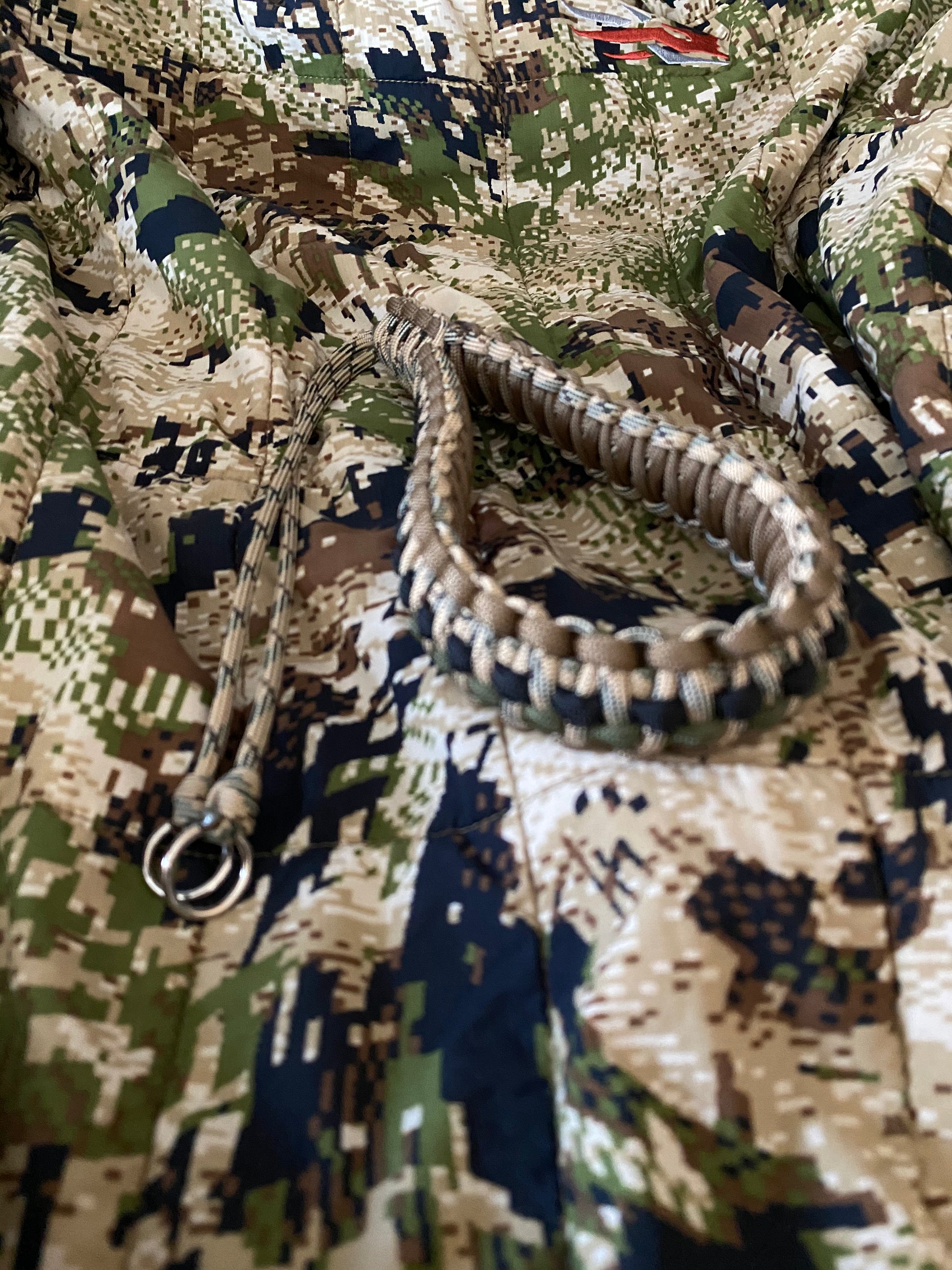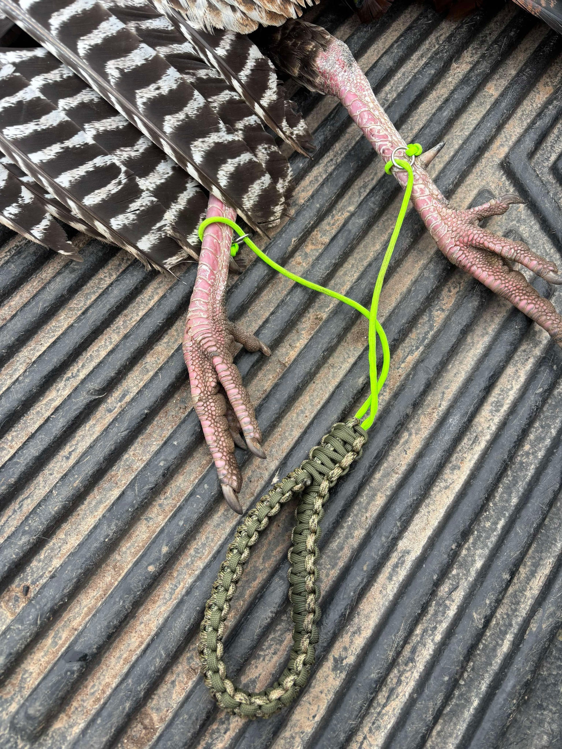 Our turkey tote shoulder allows you to carry your harvested turkey behind you while you walk out of the turkey woods. The tote allows you to hold your bird by the feet using the two leg drops attaching the looped paracord to each foot of the turkey.
